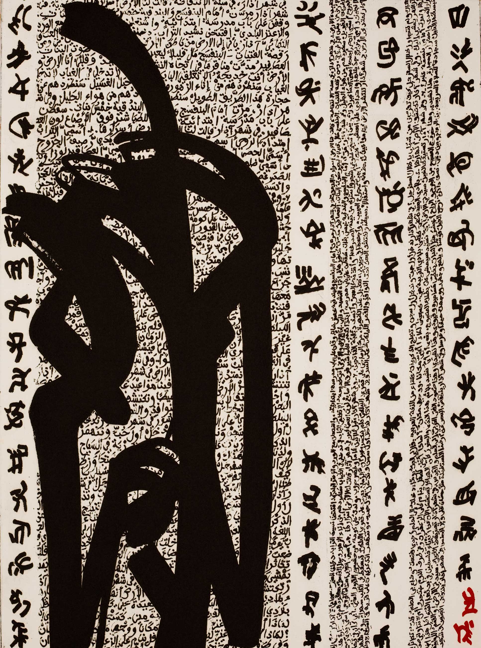 Rachid Koraïchi is informed by the Islamic concept of Safar, the spiritual journey of transcendence. His multimedia work begins with the intricate beauty of the Arabic calligraphic scripts and is also composed of symbols, glyphs and ciphers drawn from a wide variety of other languages and cultures. Golnaz Fathi completed a long and intense training in Persian calligraphy before deciding to follow her true passion for the pictorial in which she transforms calligraphy in increasingly expressive and abstract ways.