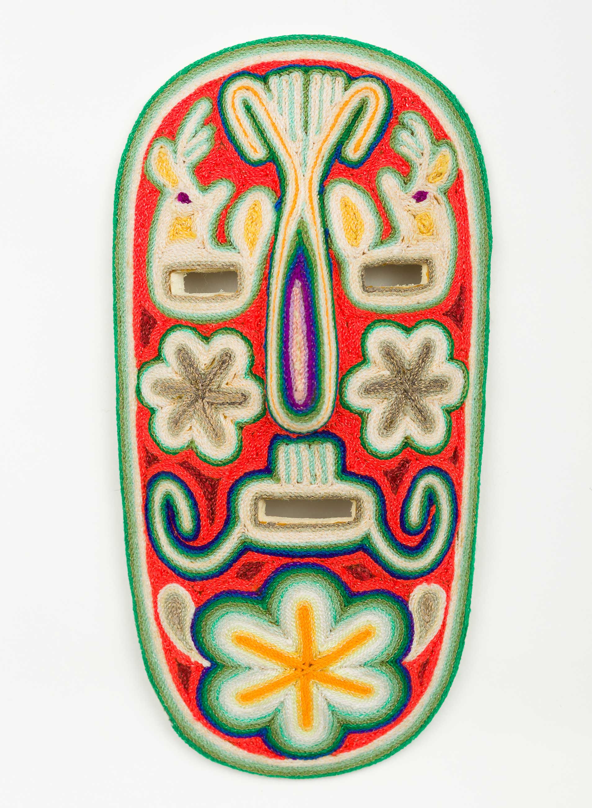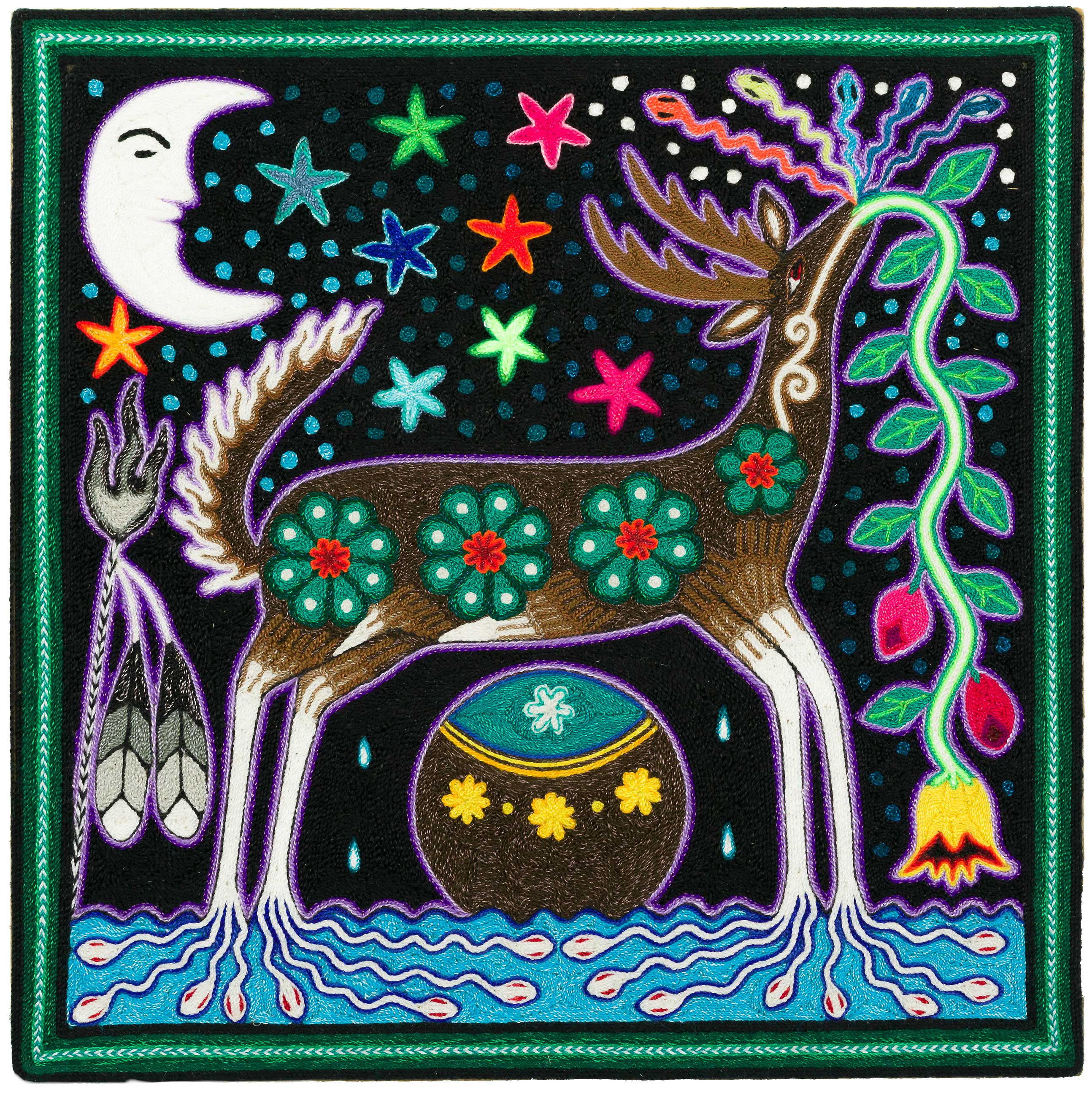 Gonzalo Hernandez Carrillo was born in 1960 in the Huichol community of San Andres, Cohamiata Jalisco and has relocated to the community Santa Catarina Cuexcomatitlan. At the age of 15 he taught himself the art of yarn painting, and in 1985 he began an apprenticeship with artist Mariano Valadez, where he refined his artistic technique. The inspiration for his work comes from the sacred teachings he received as a result of his participation in the traditional ceremonies and the pilgrimages he undertook during his position as temple official in the ceremonial centres of Pochotita and Las Latas. His yarn paintings represent the cosmological universe of the Huichol deities and ancestors. They reflect years of dedication to the study of his religious traditions.