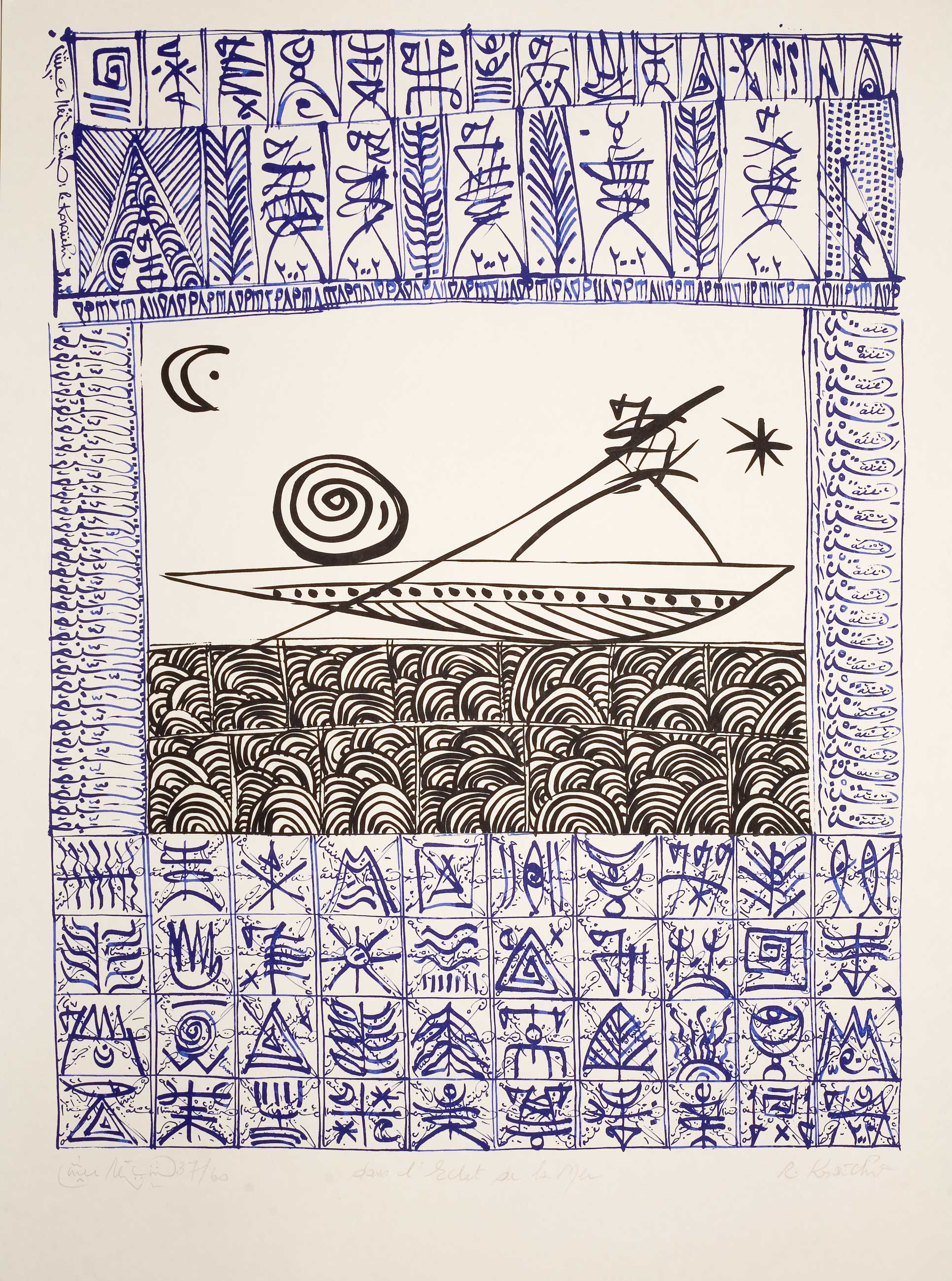 Rachid Koraïchi’s creative explorations have extended across an impressive array of media, which include ceramics, textiles, bronze, corten steel, wood and paintings on silk, paper or canvas. Over his long career, Koraïchi has been influenced by a fascination with signs, symbols and scripts drawn from a variety of languages and cultures, which he integrates to create his mixed media installations. These large-scale projects employ an array of diverse elements that are commonly executed in widely divergent places, sometimes in collaboration with practitioners of ancient, traditional crafts or, again, employing the most sophisticated of modern technological advances.