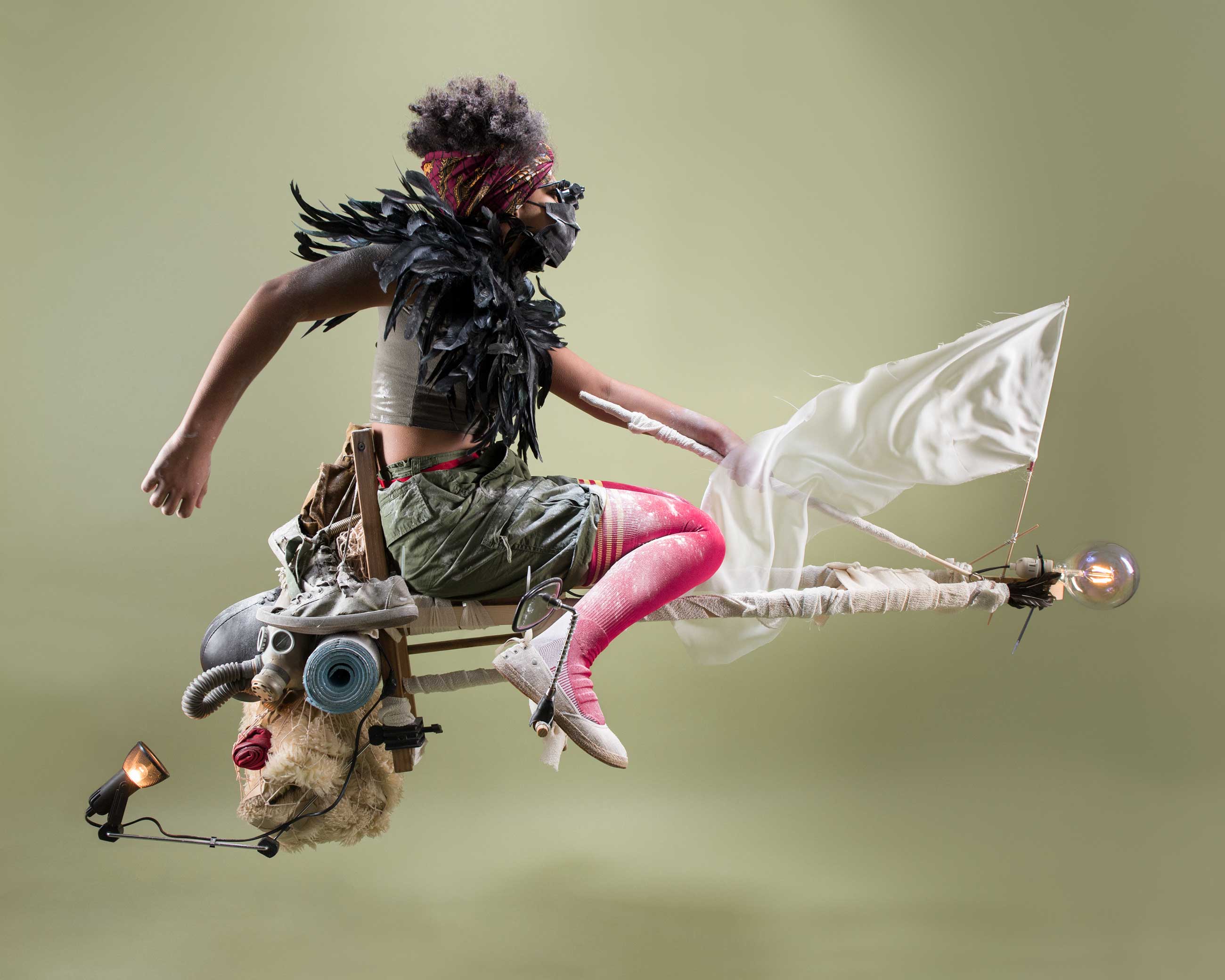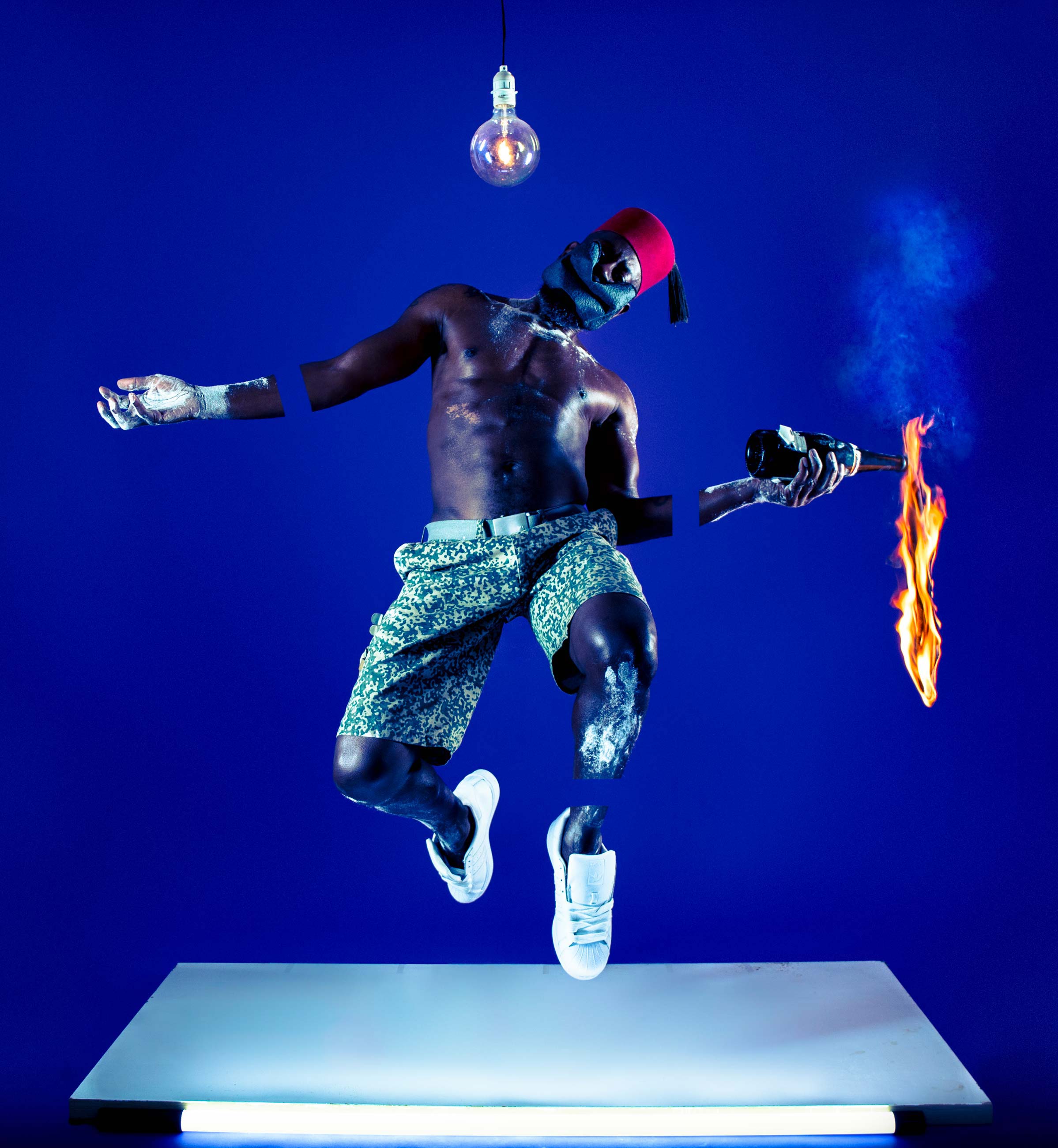 Benji Reid considers himself a Choreo-Photolist; a term he coined to encapsulate his unique practice where theatricality, choreography and photography meet in the image. His breathtaking photographs, comprised primarily of self-portraits in incredible, anti-gravitational poses with a medley of props, draws the audience into a different dimension. In the hyper-realities he presents, the subject is liberated by acts of the artist’s imagination. Whether exploring life as an outsider, issues surrounding mental health, or complexities of fatherhood, Reid makes the audience part of the discussion. Each perfectly poised portrait, set against vivid backdrops and adorned with fantastical objects, addresses the world we live in. Everyday objects like a paddle, a sparkler, or a stool transform and transport the subject into an alternative reality which offers protection and liberation.