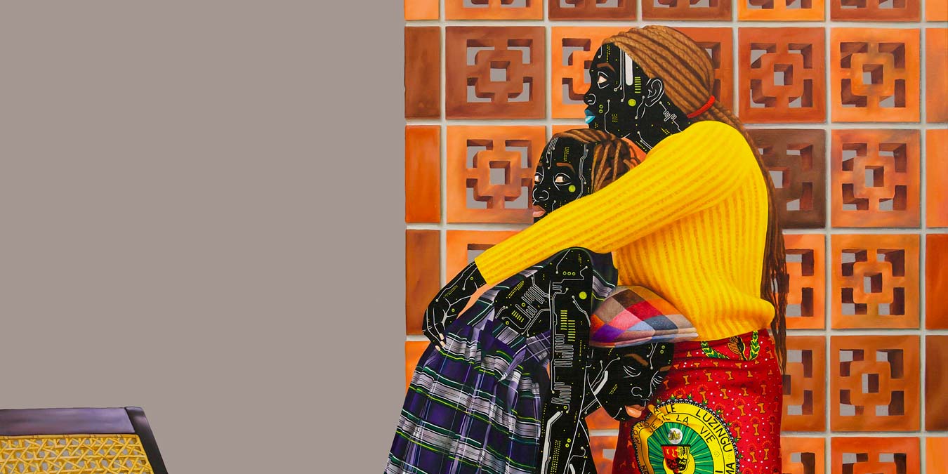 Kamuanga continues to portray his subjects with bare skin replaced by intricate electronic circuitry. This references the components of our everyday modern devices, technology that could not exist without coltan, a substance mined at volume in the DRC, with great human and environmental cost.