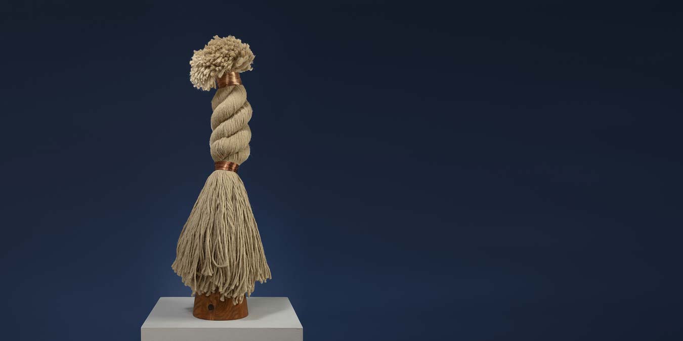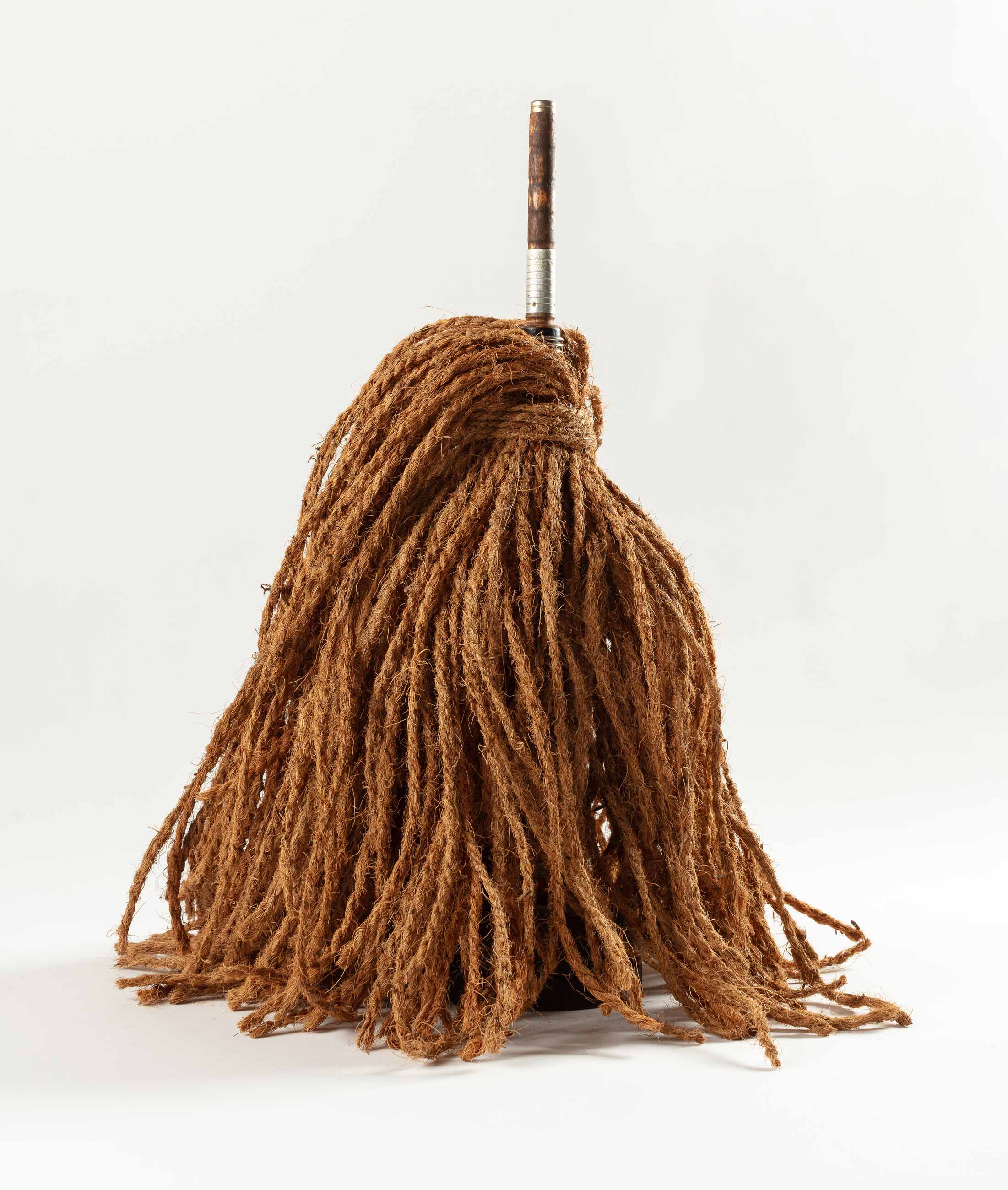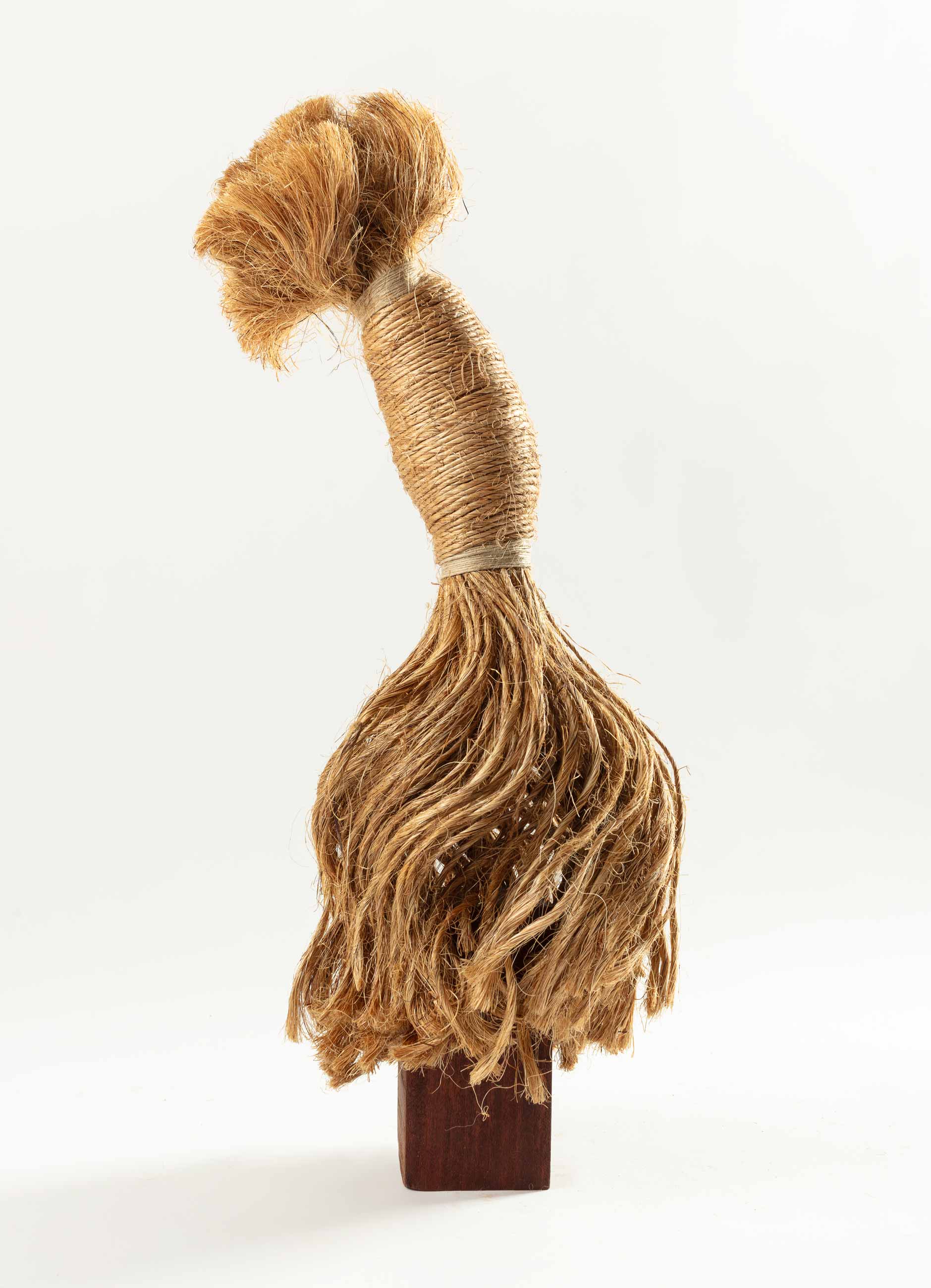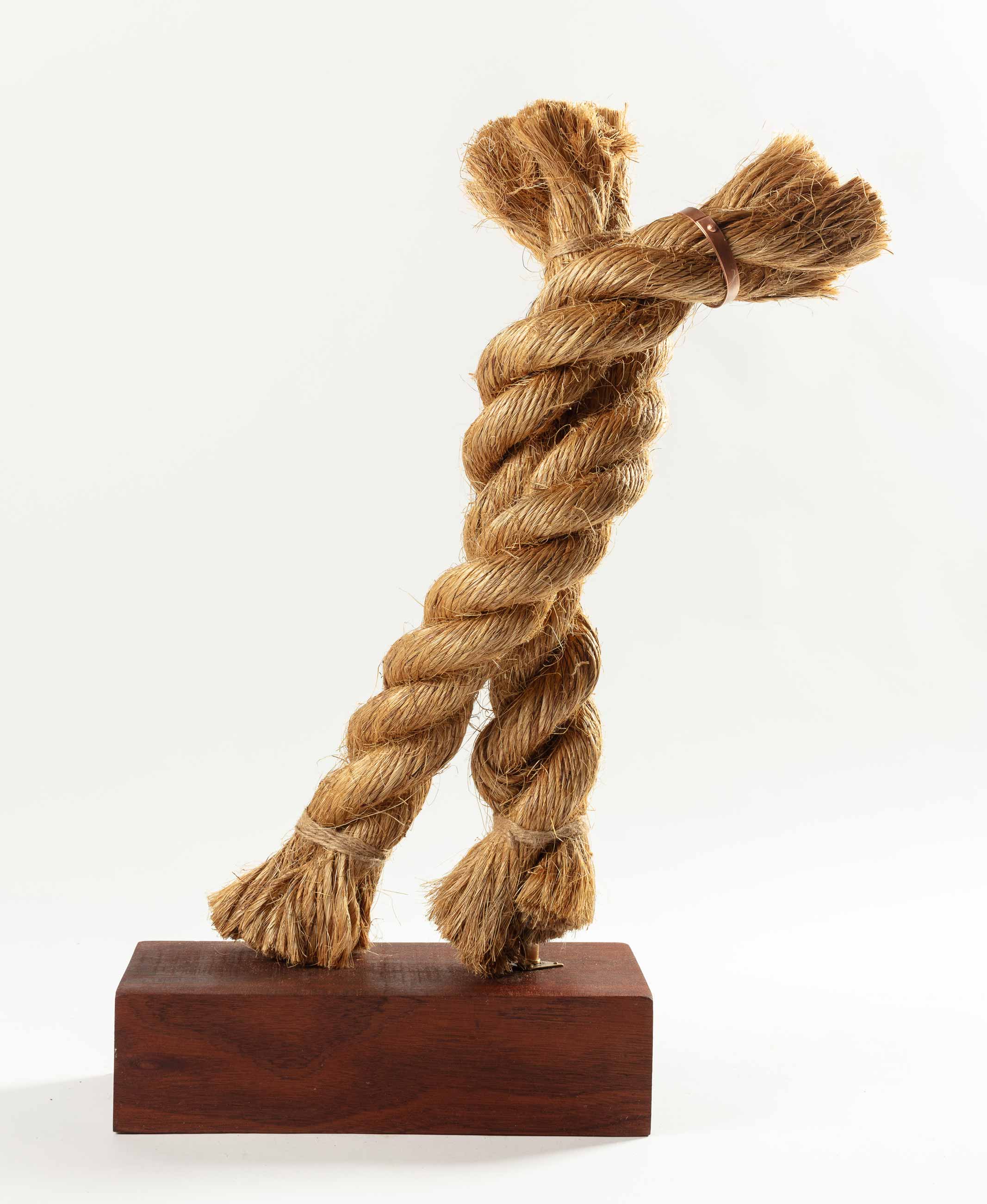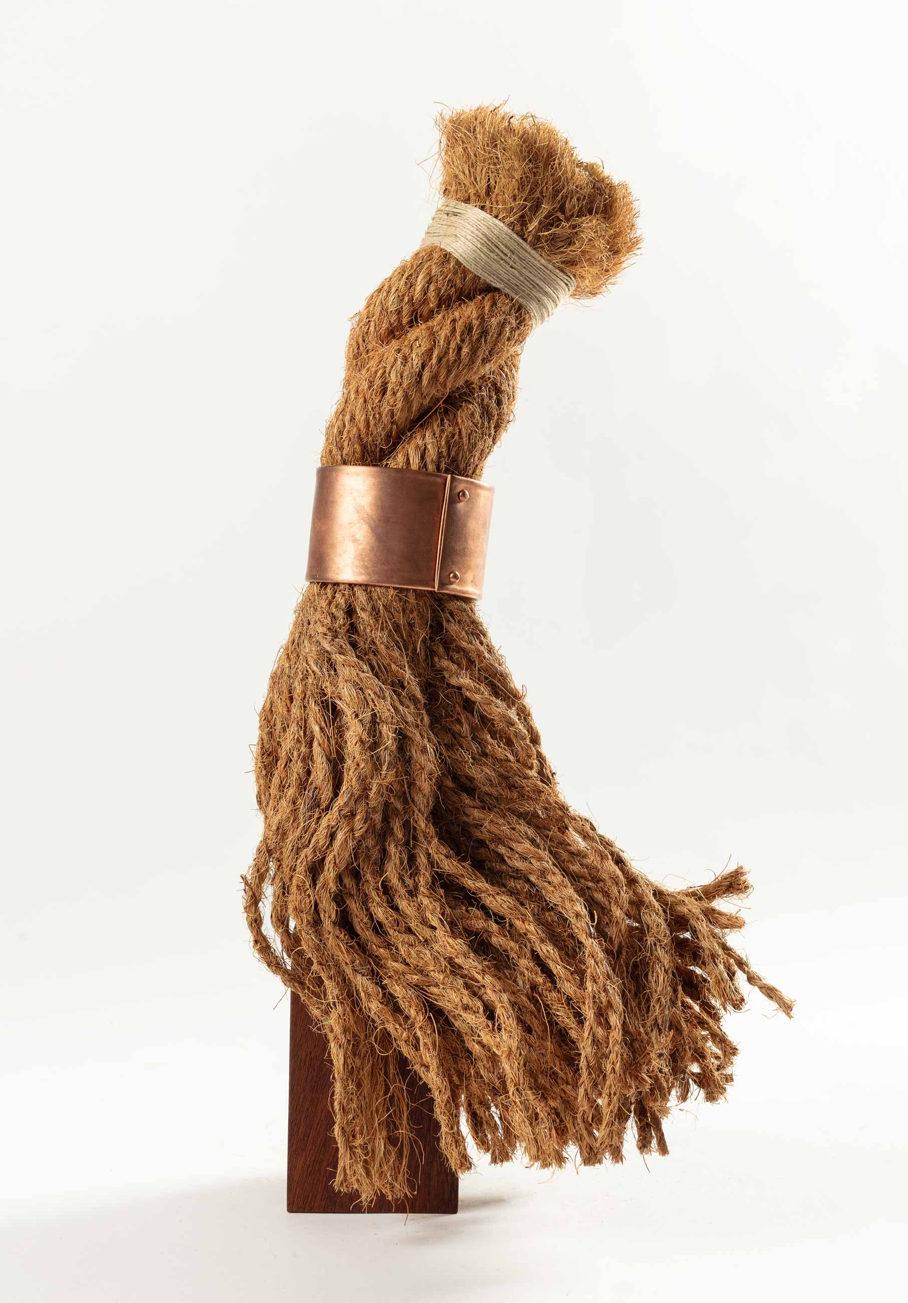 This series of rope sculptures was inspired by Barbara Ehrenreich’s book, ‘Dancing in the streets’, which locates the phenomenon of ‘collective joy’ as central to the origins of dance. Other contributing sources can be found in hunting rituals and the African spirit dances that transformed into carnival masquerades in the African diaspora. Vandy’s vivacious curvilinear sculptures challenge the typical representation of the female form –historically subjected to the male gaze – to provide a more positive depiction that associates female abstraction with empowerment. Works such as Dynamo Woman, explore similar territory. Vandy engineered giant sculptures made of a wide strip of spiralling copper – the element central to the electro-dynamic revolution that powered the later industrial age – which besides representing tornado-like guardian spirits symbolise the vital energy of the female form. In her rope ‘figures’ the strength and supple flexibility of the twined materials extend this idea by evoking suggestions of the ‘Grain Mother’ deity figure, the harvest guardian, who represents continuity and the survival of humanity. These ancestral and atavistic themes manifest in the large-scale ‘Rope Mother’ figure, which acts both as template for and energetic focus of the smaller dancing rope works that surround her. The vital, energetic forms are composed by shaping and hand-sewing sections of rope together, before tying off and binding the loose ends with twine or copper wire. Other rope sculptures subtly integrate incongruous found objects: cogs, pipes, washers skipping-rope handles, etc. While the title given to each playful sculpture names a particular dance, taken altogether, the twisting, twirling forms appear as freeze-frame captured moments of a single gyrating body dancing to the movement of time.