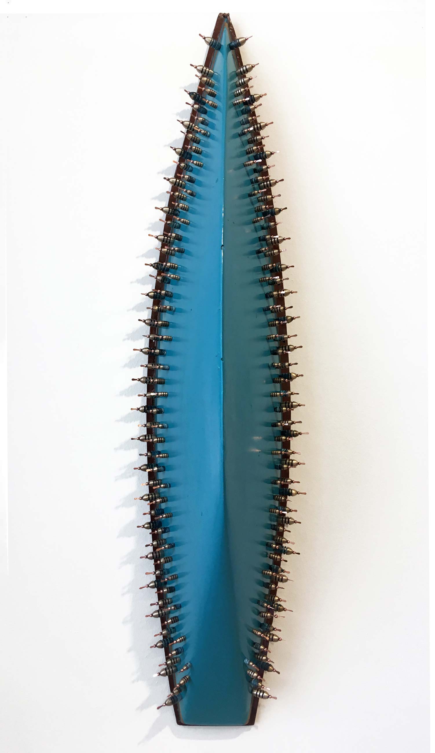 LR Vandy uses widely sourced objects she collects to transform the hulls of model boats into animated ‘masks’. Such unrelated items as fishing floats, porcupine quills and acupuncture needles ‘speak directly’ to her, as she overcomes material differences to explore feelings of attraction, repulsion, danger and protection. Vandy’s evocative ‘masks’ conjure nuanced resonances from these many objects’ histories, joining dissimilar pasts together to present imaginatively possible futures.