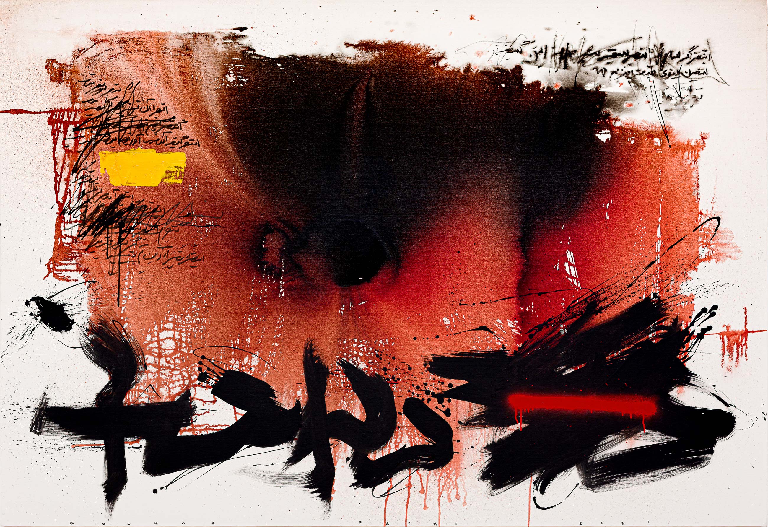 Acutely aware of the rigour of a disciplined process, Golnaz Fathi is distinguished in being one of only a handful of women trained to the highest levels within the traditional school of Persian calligraphy. However, Fathi made the conscious decision to pursue a different career as a contemporary artist instead. Fathi’s astonishing combination of a traditionally trained refinement and an instinctively bold abstraction is exemplified in such recent works as, Sunset and No rain will put out this fire… which express on canvas emotions that go far beyond the realm of simple words.