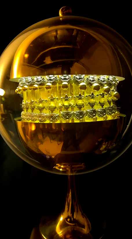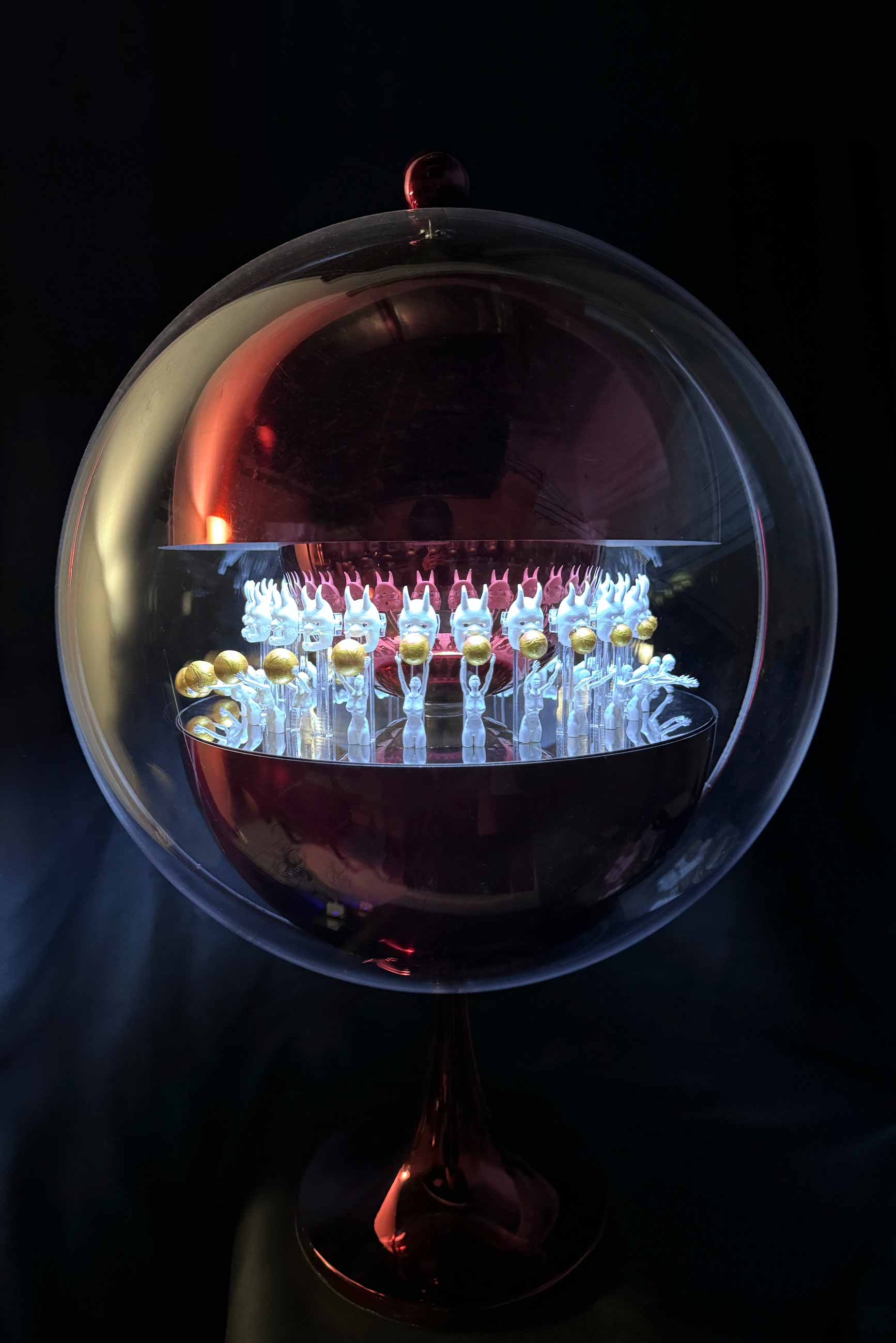 Stainless steel, acrylic, aluminium disc, mechanical transmission, LED, PE resin, alloy, 62 x 40 x 40 cm.