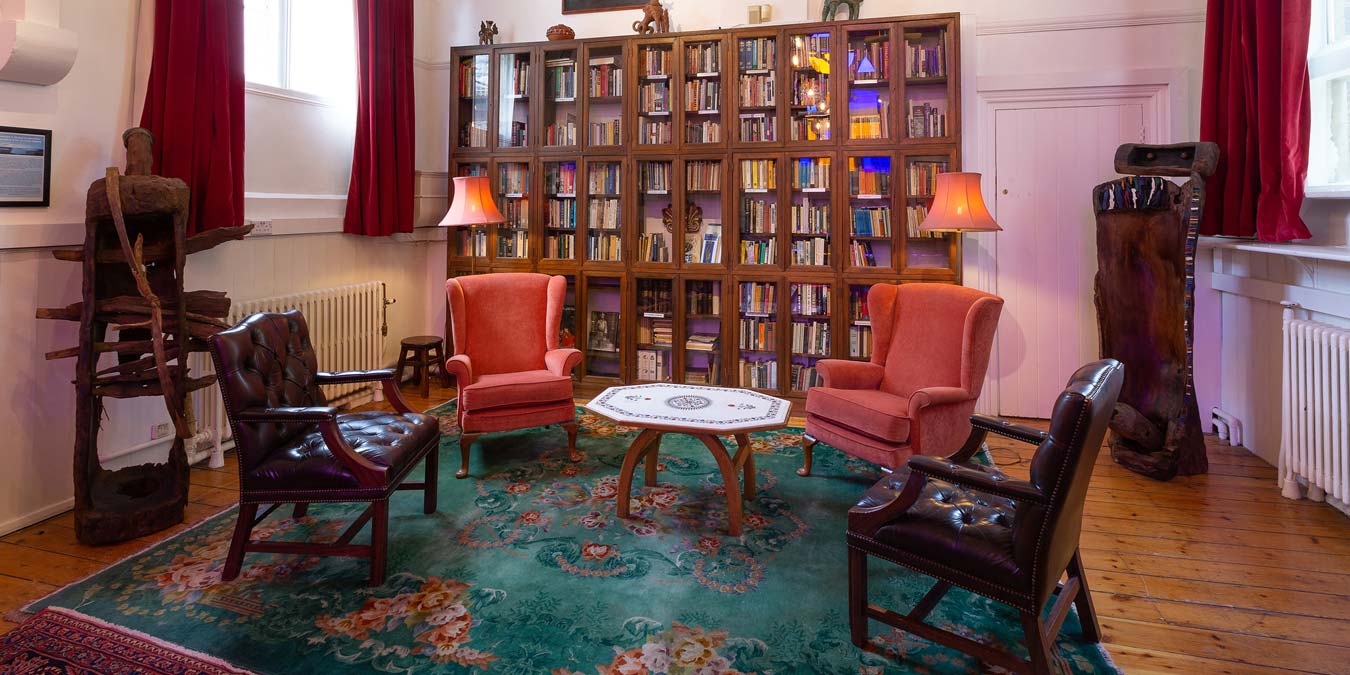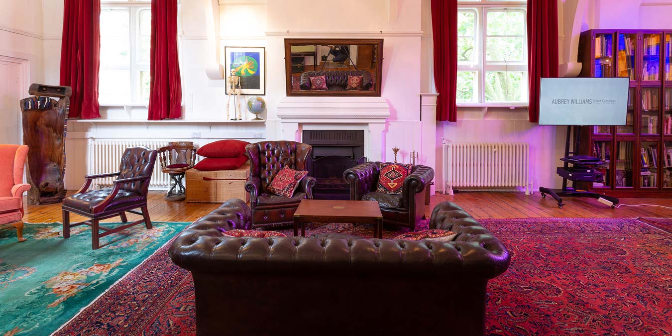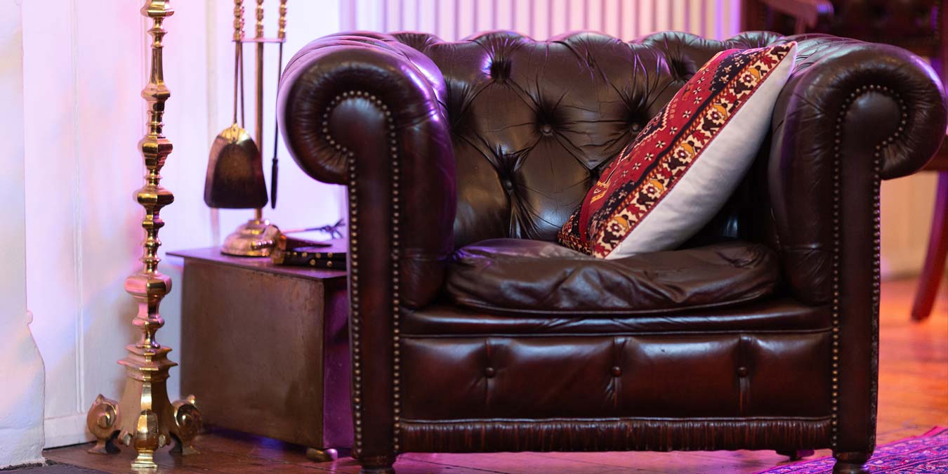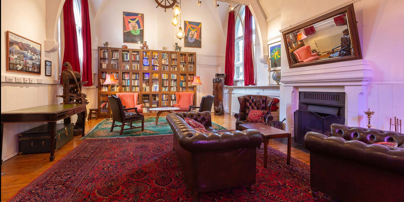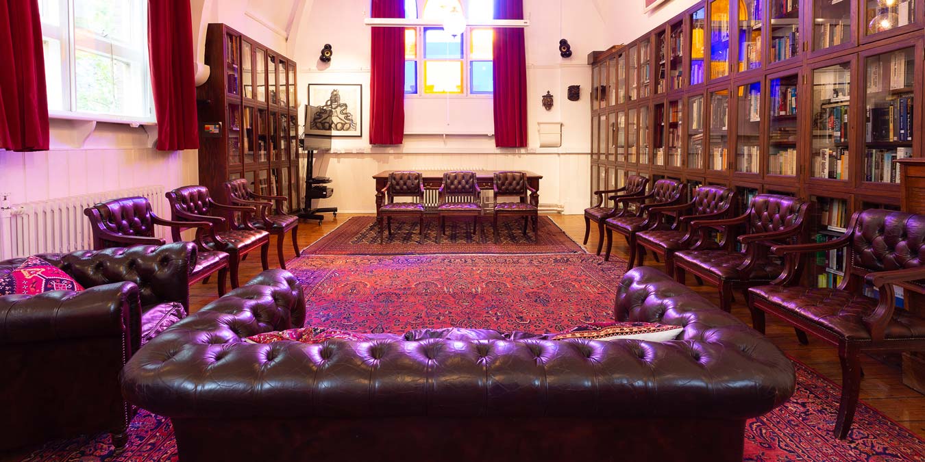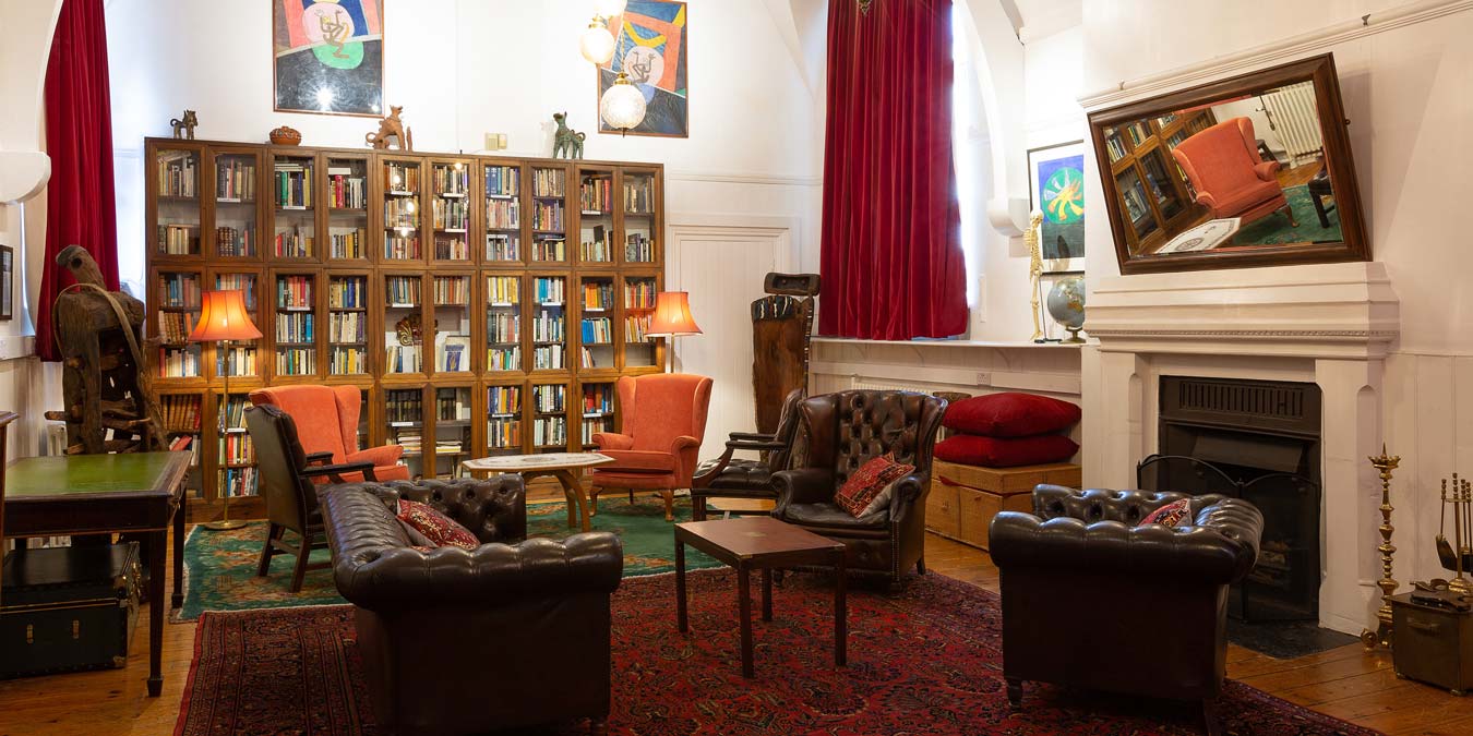 (No disabled access)A spacious library room located on the second floor of the building, beautifully lit by stained glass windows, furnished with a boardroom table, Persian carpets and leather armchairs. Peaceful and charming, the club room is the perfect space for meetings and away-days, in addition to being a versatile location for filming and photography projects.